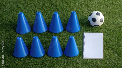© Matcha_09, Naklejka premium Blue training cones arranged in a grid with a soccer ball and a blank notebook on a green grass field for sports training concepts and practices