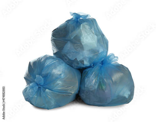 Fototapeta premium Blue trash bags filled with garbage on white background