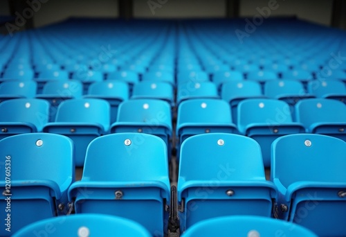 © Giuseppe Cammino, Naklejka premium Blue tribunes. seats of tribune on sport stadium. empty outdoor arena. concept of fans. chairs for audience. cultural environment concept. color and symmetry. empty seats. modern stadium