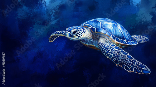 Fototapeta premium Blue turtle swimming in deep blue water.