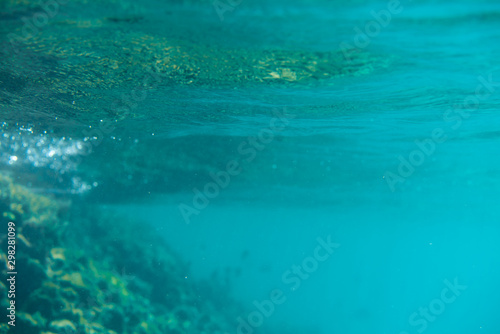 © Ксения Левашова, Fototapeta premium Blue underwater bokeh ,light particles. Abstract. Atlantic ocean