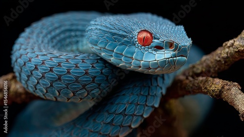 Fototapeta premium Blue viper snake close up with red eyes exotic reptile wildlife photography...
