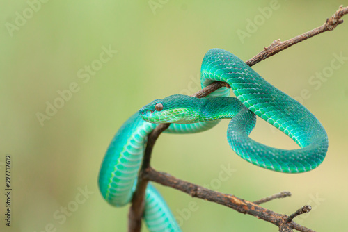 © Taufik, Fototapeta premium Blue viper snake on branch, viper snake ready to attack, blue insularis, animal closeup