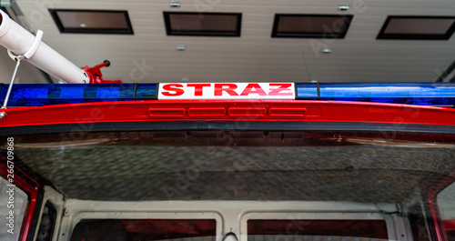 © Michal, Obraz premium Blue warning signals placed on the roof in a fire truck with the Polish inscription "STRAZ".
