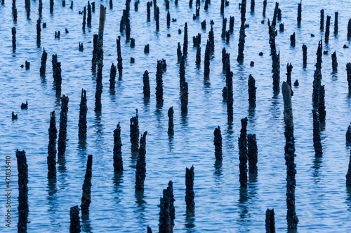 Obraz premium Blue Water Through Old Wood Pilings