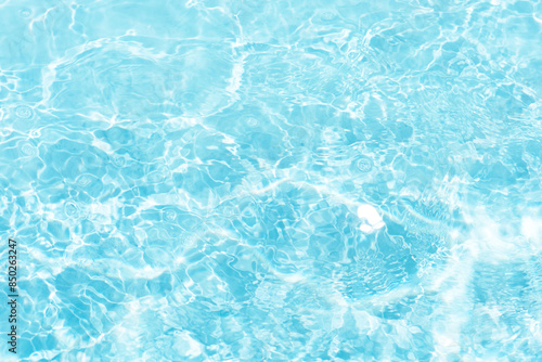 Obraz premium Blue water with ripples on the surface. Defocus blurred transparent blue colored clear calm water surface texture with splashes and bubbles. Water waves with shining pattern texture background.