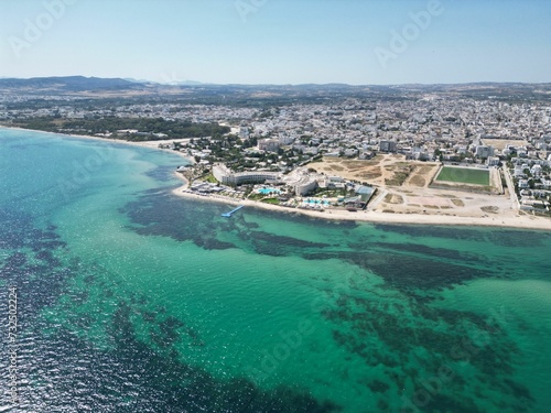 © Wirestock, Fototapeta premium blue water with white buildings in the background and a sandy beach in front of it