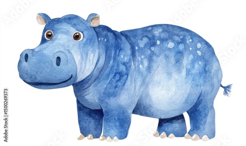© Tunsale, Fototapeta premium Blue watercolor hippo doll for kids on white background. AI generated illustration.
