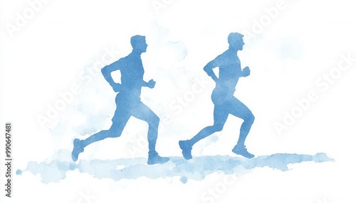 © MagicAI, Naklejka premium Blue watercolor illustration of two runners in motion on a white background.