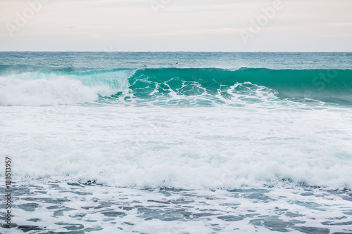 Fototapeta premium Blue wave in ocean and clouds sky. Wave for sufring