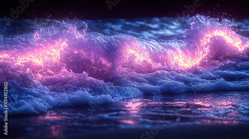 © Lukita, Fototapeta premium Blue waves crashing into the seashore with neon color algae in the night. 4k HD background wallpaper.