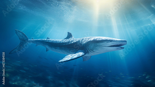 Fototapeta premium blue whale gliding underwater, lens flare from the sunlight penetrating the...