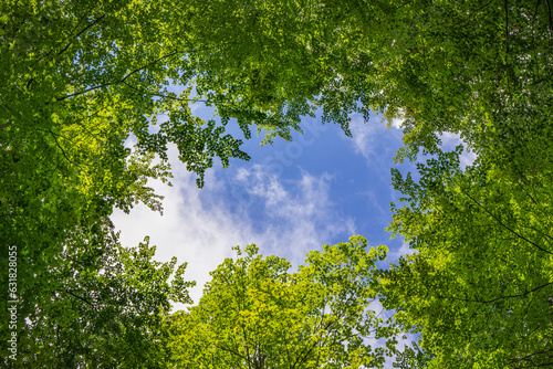 Obraz premium Blue-white sky framed in the fresh green of beech leaves