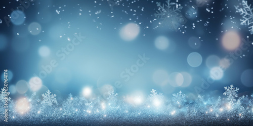 Fototapeta premium Blue winter background with snowflakes and bokeh