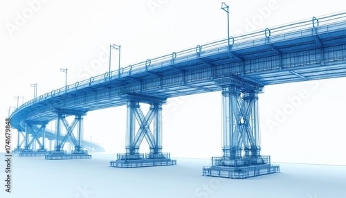 Fototapeta premium Blue wireframe blueprint shows modern highway bridge structure. Digital illustration highlights skeletal supports, road deck, detailed design. Tech drawing represents civil engineering, urban