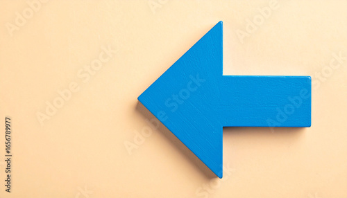 Fototapeta premium Blue wooden arrow pointing left on beige backdrop. Return, backtracking,...