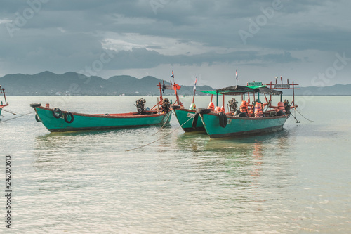 Fototapeta premium Blue wooden fishing boats in calm tropical turquoise water near Rabbit Island in Cambodia