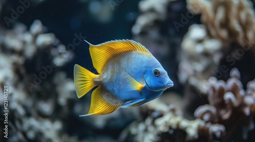 © Yopi, Naklejka premium Blue Yellow Fish Swimming In Dark Coral Reef Aquatic Environment