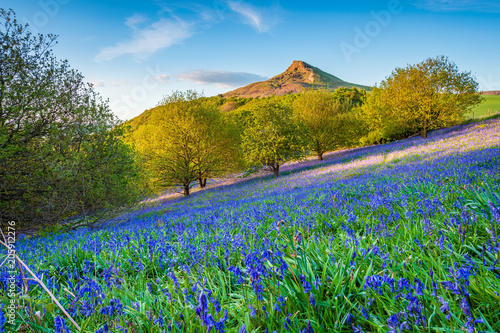 Naklejka premium Bluebell Slope and Roseberry Topping / Newton Wood and Roseberry Topping, a distinctive hill in North Yorkshire, are popular with walkers and ramblers