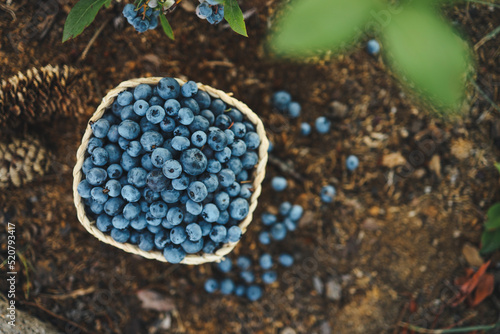© shine.graphics, Fototapeta premium Blueberries in a basket against the background of a bush with berries