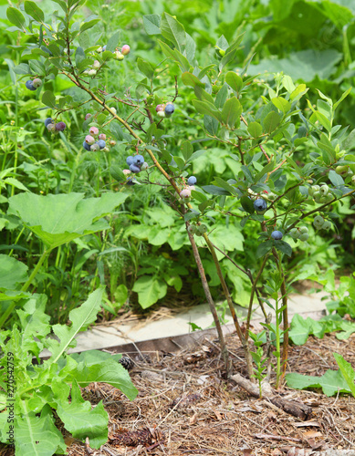 © Nadzeya Pakhomava, Fototapeta premium Blueberries ripen on a branch in the garden, organic farming. Harvest of useful berries in the open field on the bush, gardening.