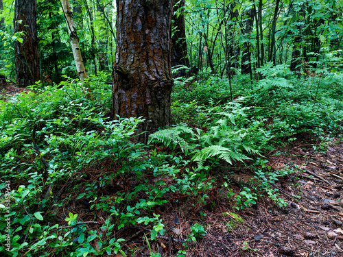 © Svetlana, Fototapeta premium Blueberry bushes in the forest. Glade of blueberries. Beautiful summer forest with different trees.