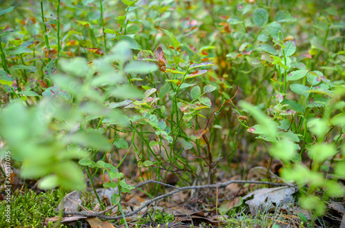 Fototapeta premium Blueberry plants with green leaves on the ground