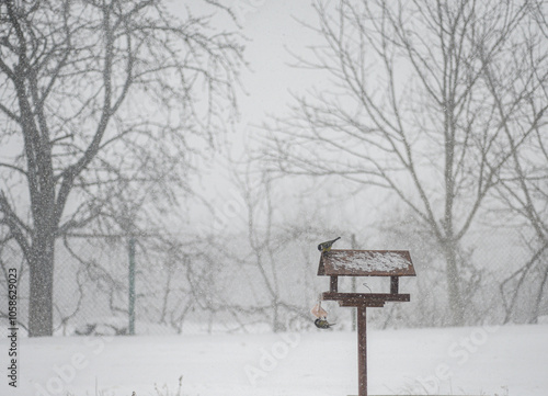 © Nadiyka, Naklejka premium Bluebirds at a bird feeder in the snow