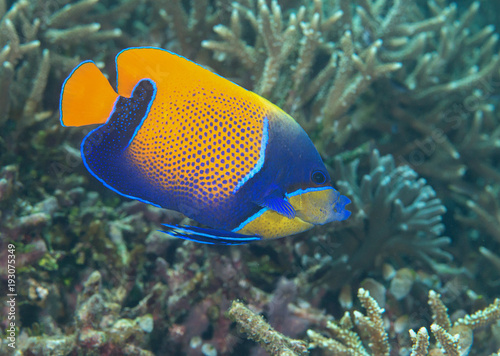 Fototapeta premium Blueface or yellowface angelfish ( Pomacanthus xanthometopon ) swimming over...