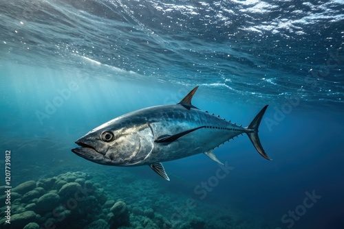 Naklejka premium Bluefin tuna swimming in the open ocean with a dark horizon, tuna, sea,...