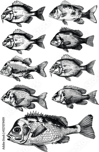 Fototapeta premium Bluegill Fish Set Illustration in Detailed Ink Sketch, Showcasing the Popular Freshwater Species with Vintage Hand-Drawn Precision