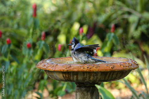 © Jillian Cain, Naklejka premium Bluejay getting all it's feathers wet as it baths in a bird bath