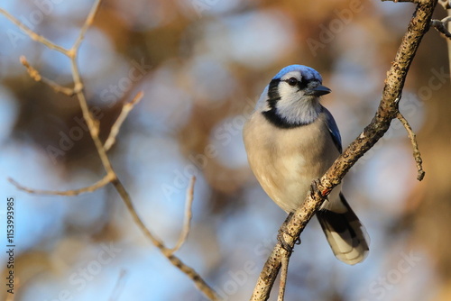 © Mark, Fototapeta premium Bluejay perched against blurry blue sky background.