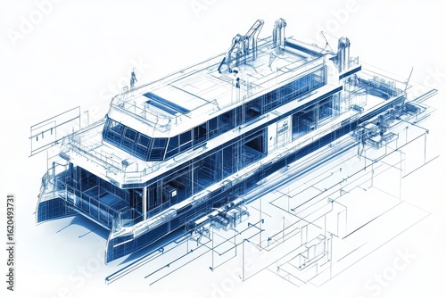 © DarkinStudio, Obraz premium Blueprint diagram of an electric ferry system with charging docks, sustainable port infrastructure, and renewable power integration. Green marine transit concept. White background.