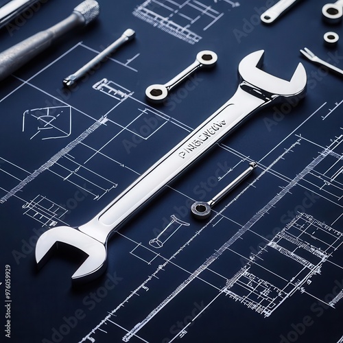 Fototapeta premium Blueprint of a wrench laid out with other mechanic tools, industrial...
