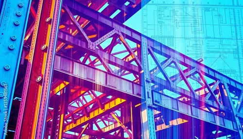 Fototapeta premium Blueprint overlaying steel beams, girders, and rivets in a double exposure effect, technical drawing, lines