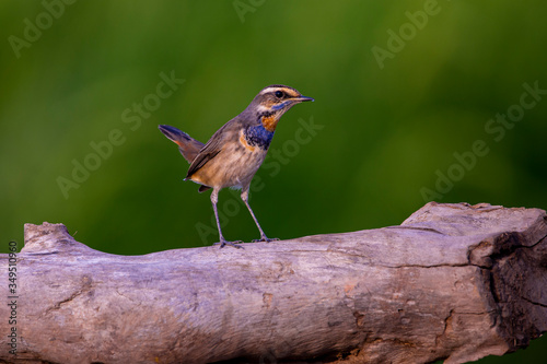 Fototapeta premium Bluethroat bird standing on a log, the neck has an orange stripe, blue stripe...