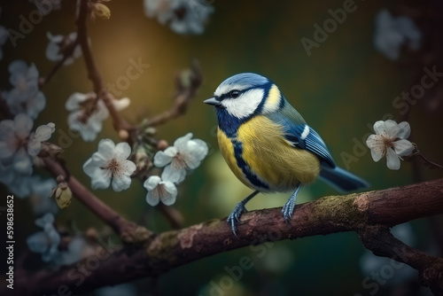 © Mr. Bolota, Fototapeta premium Bluetit_sitting_on_the_flower_fence_spring_background