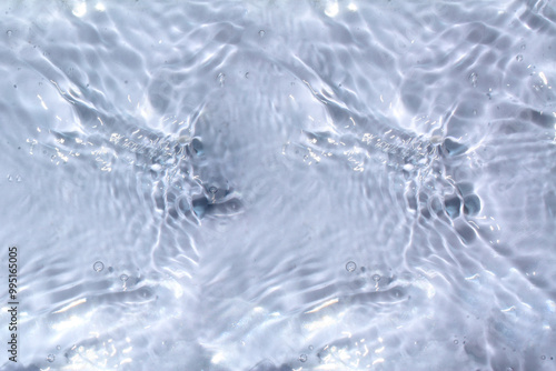 Obraz premium Bluewater waves on the surface ripples blurred. Defocus blurred transparent blue colored clear calm water surface texture with splash and bubbles. Water waves with shining pattern texture background.