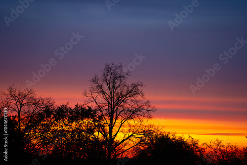 © Rolandas, Obraz premium bluish-pinkish-yellow morning skies. Dark tree silhouettes.