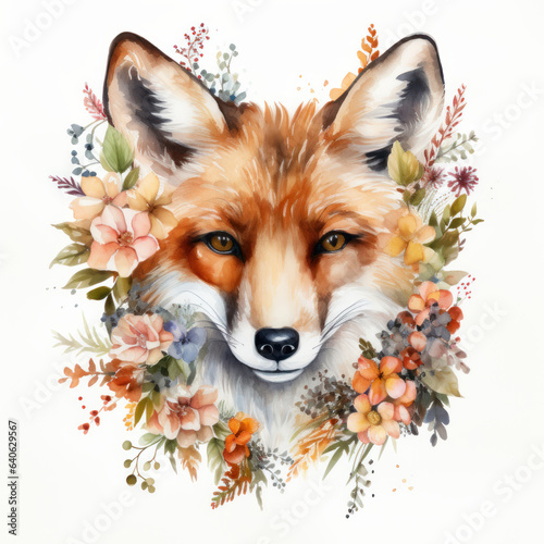 Fototapeta premium Blumige Eleganz: Wasserfarbenzeichnung eines Fuchskopfs mit einer bezaubernden Blumengirlande, Generative AI