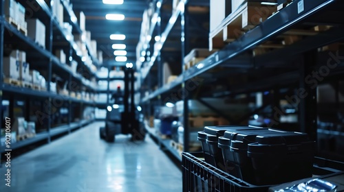 © The Little Hut, Fototapeta premium Blur background of smart robotic machine inspecting product in storage Warehouse interior with shelves bins and a forklift Industrial storage and logistics facility Design for poster S : Generative AI