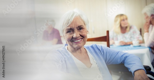 © vectorfusionart, Fototapeta premium Blur effect with copy space against caucasian senior woman smiling at retirement home