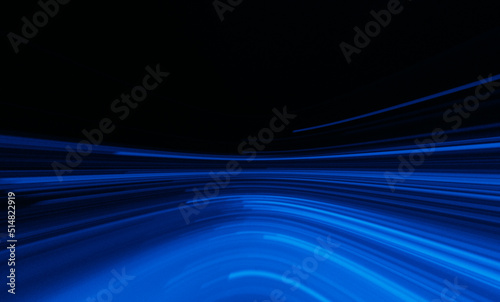 © golubovy, Naklejka premium Blur futuristic glow. Neon abstract background. Sci-Fi illumination. Defocused luminous navy blue color curve lines light flare motion on dark black copy space.