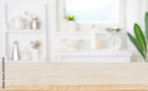 Fototapeta premium Blur kitchen counter background with wooden table for product display