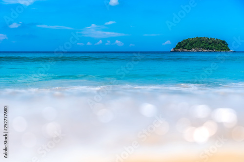 Fototapeta premium Blur tropical beach with bokeh sun light wave abstract background.