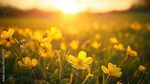 © Phannaporn, Fototapeta premium blur Yellow flowers in a meadow with warm sunlight at dusk