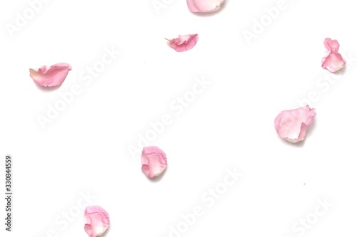 © Oradige59, Fototapeta premium Blurred a group of sweet pink rose corollas on white isolated with copy space and softy style