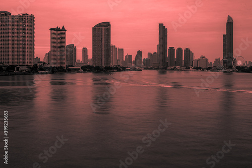 © bangprik, Fototapeta premium Blurred abstract background of high-rise buildings built by the river, lit at night, the distribution of residences of today's capital so
