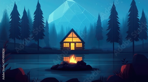 © Cyber Shutter, Fototapeta premium Blurred Abstract Log Cabin In Neural Network Style Surrounded By Trees And Featuring A Stone Fire Pit In Front
